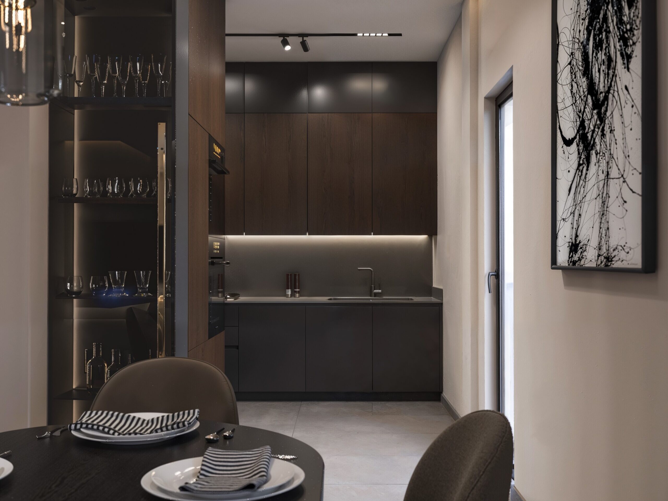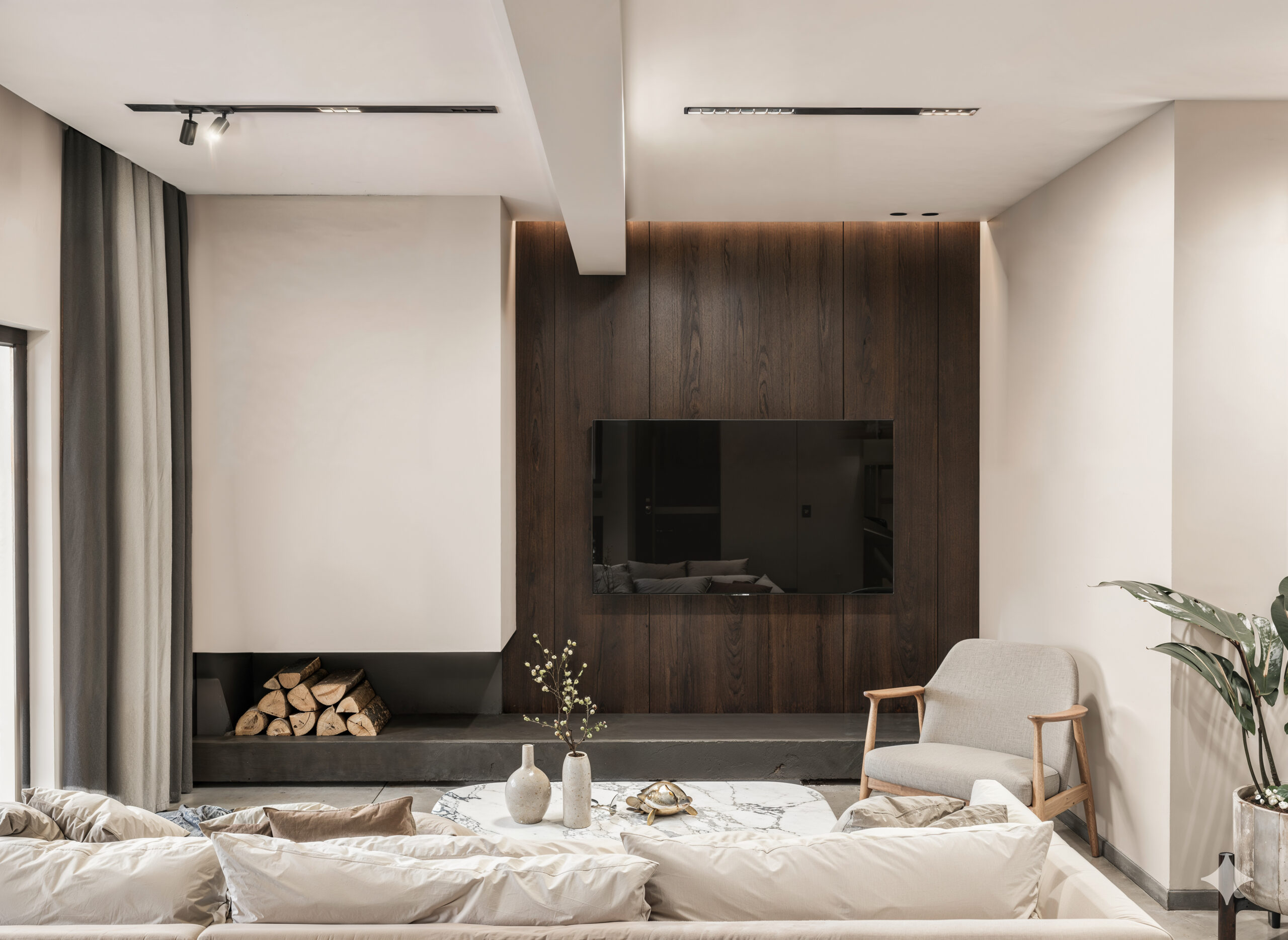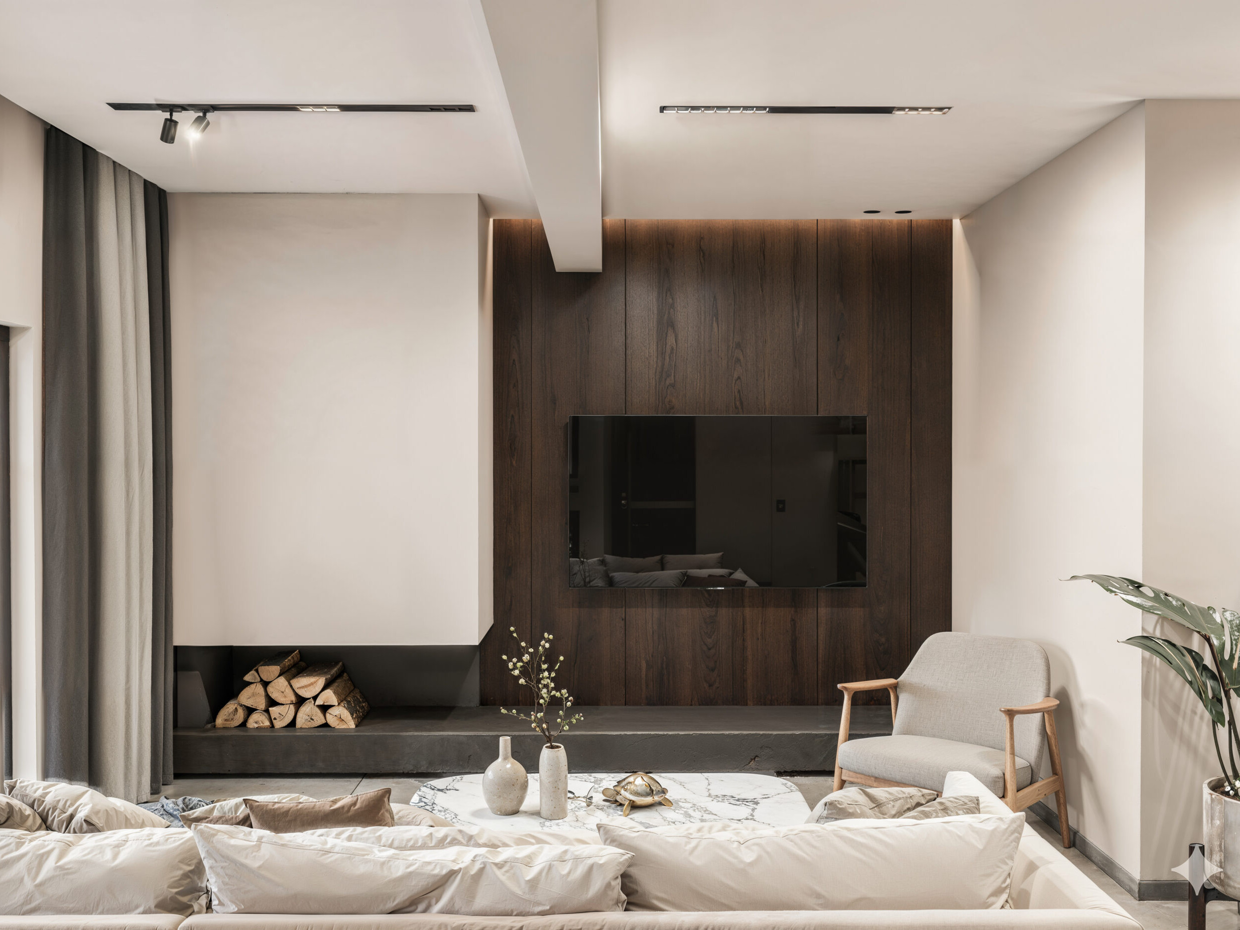 This elegant two-bedroom apartment in Aigaleo combines modern design with timeless comfort. The open-plan living area seamlessly connects the kitchen and lounge, enhanced by a sleek fireplace that anchors the space. Neutral tones, refined materials, and soft lighting create a calm yet sophisticated atmosphere. The residence includes a main bathroom and a separate WC, both designed with minimalist detailing and high-quality finishes. A perfect example of contemporary urban living with a warm, inviting character.
